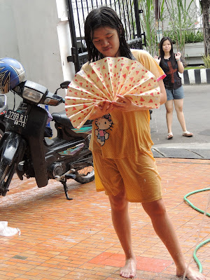 hehehe seru ya b'day siram-siraman aer, jangan lupa habis itu ngepel lantai wkwkwk. Lebih seru lagi pas foto bertiga ada air mancur yang mengudara :P